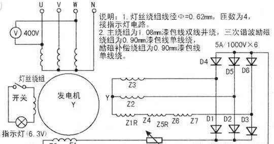 柴油發(fā)電機組實質是臺三次諧波自勵磁凸式三相四線同步發(fā)電機,因具有輸出功率大、適合移動等優(yōu)點,故廣泛用于廠礦、工程施工等場合。雖然功率不同的發(fā)電機,其繞組數(shù)據(jù)有所不同,但電路連接基本相同。
